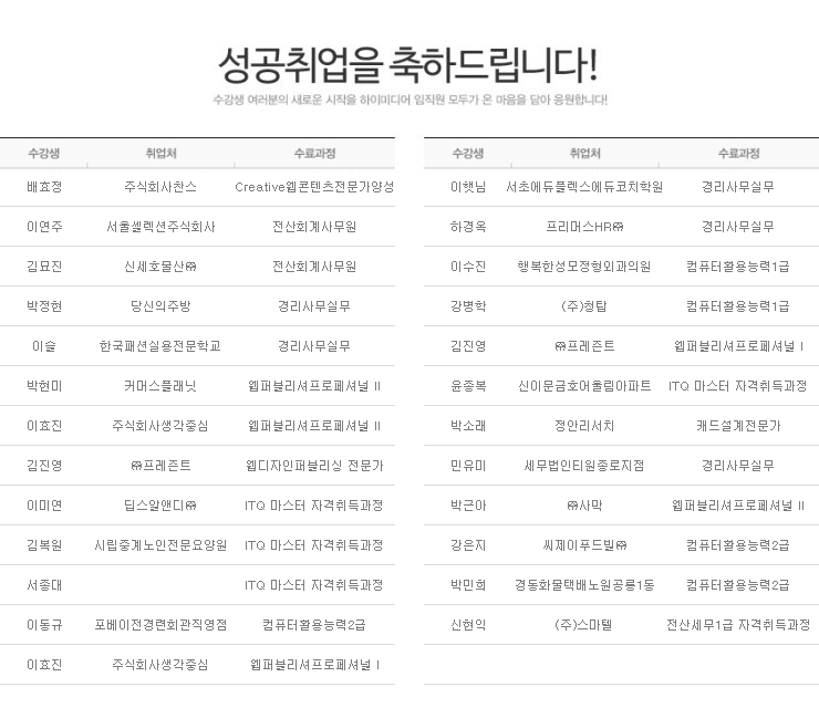하이미디어컴퓨터학원 노원캠퍼스 2015년 5월 성공취업자 명단입니다.